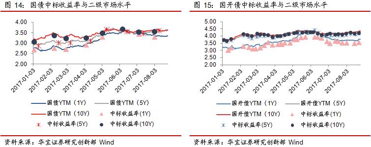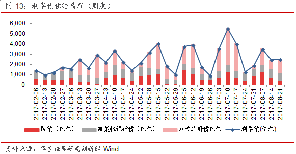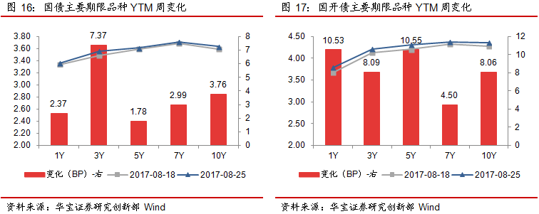 资金面维持偏紧状态,债券市场收益率小幅走高。上周,央行考虑财政投放、国库现金定存操作、金融机构法定准备金退缴等因素将投放流动性,公开市场操作净回笼2500亿元,资金面继续维持偏紧的状态。资金面的持续紧张,使得债券市场的情绪受到了压制。此外,供给侧改革深化和环保督查的持续发酵引发了市场对于大宗商品持续上涨的担忧,大宗商品价格的持续上涨也带动了债券市场收益率的抬升。上周,债券收益率曲线整体向上抬升,10Y国债收益率上行3.8bp至3.63,10Y国开收益率上行8bp至4.36,距5月份的年内高点只有“一步之遥”。一级市场招标也显示市场情绪较弱。对于信用债而言,收益率整体上行,且上行幅度普遍在7-12bp之间,信用利差进一步压缩。在基本面、政策面等在短期没有超预期的情况下,资金面成为目前市场的主要矛盾,资金面的持续偏紧也在一定程度上压制了债市的表现。