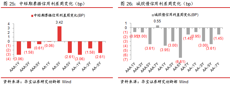 信用利差整体收窄。上周,各期限的城投债以及中票的债券收益率均出现了显著的上升。无论是城投债还是中短票,仅有个别品种利差走阔,多数等级以及期限债券的信用利差均出现了进一步收窄。