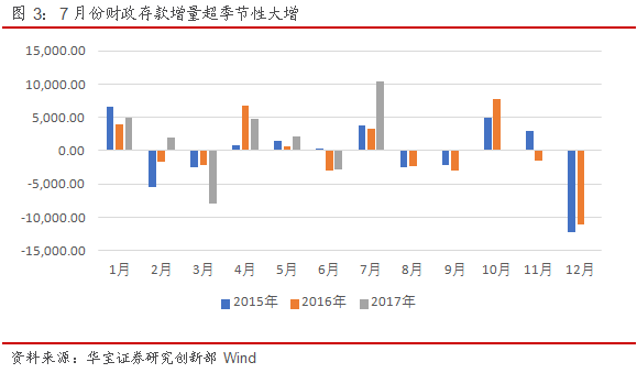 超储率维持低位情况下,市场的流动性受央行投放和财政收支的影响出现大幅波动。8月中旬开始,受缴税的影响,资金面开始收紧,但是超出市场预期的是资金面的紧张在8月下半月一直持续,预计的财政投放并没有对冲掉央行对于资金的净回笼的影响。尽管央行不断强调“削峰填谷”的货币政策操作思路,但是超储率持续历史地位,使得整个市场的流动性并不充裕,银行向非银投放流动性的意愿并不是太强烈,所以当央行的货币投放回笼与财政的收支出现一定的错位时,非银的流动性面临较大的不确定性。7月份,受缴税和地方债大规模发行影响,财政存款增量大幅超预期,达到1.16万亿,是历史上单月最高的增量,也明显超过7月份的季节性。在财政存款大幅上升的情况下,央行并没有大幅投放流动性,使得整个银行体系的超储处于较低位置,根据我们的测算,7月底银行的超储率在1.18%左右。目前来看,由于外汇占款持续下滑,流动性的投放主要靠央行的公开市场操作,在“中性稳健”的货币政策下,央行保持定力的可能性较大,不会大幅投放流动性,整个银行体系超储率将会继续保持较低水平,短期来看,财政财政收支与央行操作的错节将是造成市场资金面的波动的主要因素。