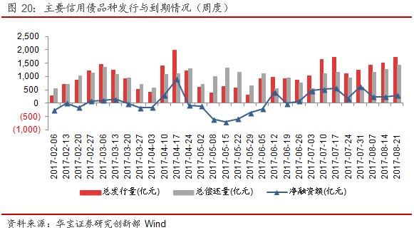发行市场整体比较平稳,净融资额有小幅上升。上周非金融企业短融、中票、企业债和公司债合计发行约1708.9亿元,偿还规模约1413.78亿元,净融资额约295.12亿元,基本与前一周持平。