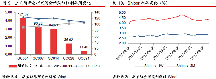 上周,央行考虑财政投放、国库现金定存操作、金融机构法定准备金退缴等因素将投放流动性,公开市场操作净回笼2500亿元,资金面继续维持偏紧的状态。银行间隔夜质押回购利率收于2.9359%,较前一周下行5.5BP;7天质押式回购收于3.5840%,较前一周上行5.7BP;14天质押式回购收于4.1750%,较前一周下行7.4BP;1个月质押式回购收于4.0926%,较前一周下行4.6BP。7天Shibor收益率收于2.9098%,较前一周上行1.6bp;3个月期Shibor收于4.3689%,较前一周上行2.5bp。交易所市场方面,GC001收于4.2850%,较前一周大幅下行17bp;GC007收于4.2826%,较前一周上行1.34bp。