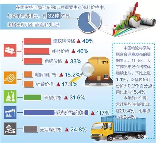 在国家统计局公布的50种重要生产资料价格中,与今年年初相比,有32种产品价格出现了不同程度的上涨。
