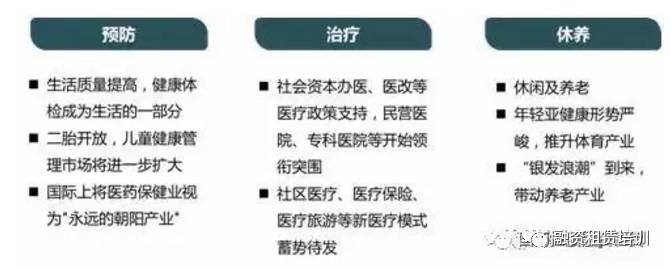 健康服务领域以“预防——治疗——休养”为主线,每一环节都蕴含着蓄势待发的潜力。