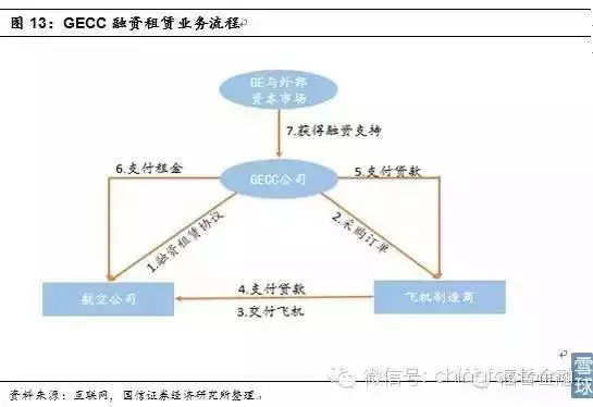 大型设备融资租赁为基础的供应链金融模式。飞机融资租赁业务是GEC供应链金融崛起的关键因素,飞机单价高、使用期限长,天然适合做融资租赁,GEC通过 融资租赁服务促进厂商飞机设备的销售。首先,GEC与航空公司签署融资租赁协议,由GEC直接向飞机制造商下订单、付款采购飞机。飞机交由航空公司后,航 空公司按期支付本金以及相应利息给GEC。