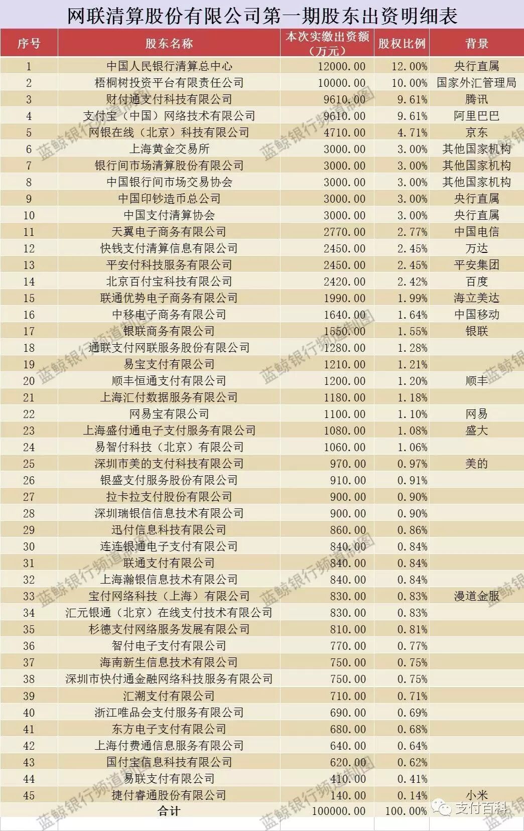 按照流传的“网联清算股份有限公司第1期股东出资明细表”来看,第一期45家机构实缴出资10亿元。中国人民银行清算中心本次实缴出资额达1.2亿元,占比达12%,为第一大股东。梧桐树投资平台有限责任公司(国家外汇管理局直属机构)本次出资1亿元,股权占比达10%,居第二。支付宝和财付通股份同列第三方大股东,占比9.61%。京东旗下网银在线紧随其后占比4.71%。