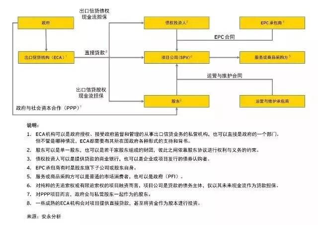 在这一体系中,ECA承担了重要角色,它不仅为投资人和项目公司提供不同程度的担保,同时也会在一些案例中作为直接贷款出资人。