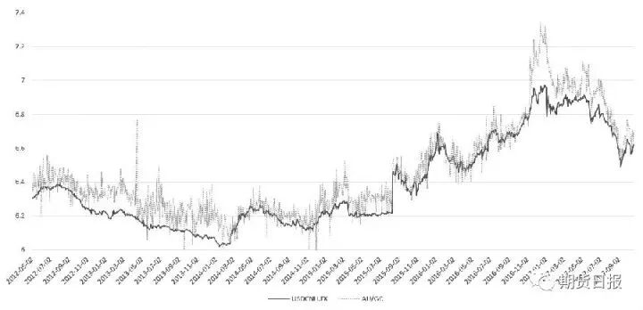 有了USD/CNH作为基本的套利对象,那么就需要挑选另外两个合约来合成USD/CNH头寸,参考了流动性、商品属性和对各类事件的敏感性,笔者选择黄金作为合成汇率头寸的媒介。作为避险资产,黄金被各国央行和大型资产管理机构以资产配置的一部分持有,拥有很大的流动性,不容易出现异常波动;同时黄金对政治、经济和风险事件反应敏感,不容易出现长时间的价格偏离。黄金期货合约选择芝商所的GC合约和上期所的AU合约(图1)。数据使用自2012年USD/CNH合约上市后到2017年10月的COMEX黄金合约和SHFE黄金合约的收盘价格。