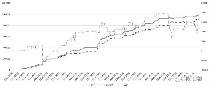 整个交易过程跨越5年,总共交易53次,平均一年10次,胜率100%,平均盈利1.8万元人民币左右(单笔美元盈亏以当日离岸人民币换算)。净盈利以当日的美元加人民币的总盈利以当日离岸人民币汇率换算为人民币盈利累积。期末盈利近100万元人民币,累积净值1.374,年化收益率6.56%(图6)。