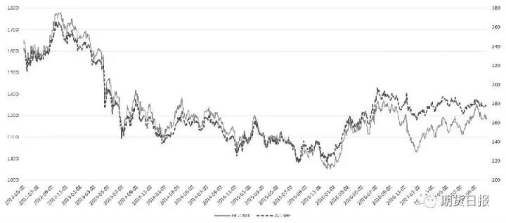 图1 GC和AU合约价格对比(主坐标为GC,副坐标为AU)
