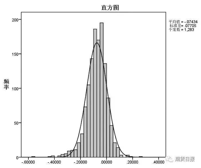 进一步对价差数据进行频率分布分析(图5),发现其分布的峰度为3.015,非常接近标准正态分布,但平均值为-0.074。据此判断如果价差进入了历史(过去60个交易日)的极端范围(95%之外)之后,价差会向中位数区域回归。