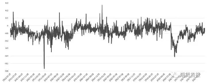接下来对两者的相关性进行测算(见图3,横坐标为合成汇率,纵坐标为USD/CNH期货),发现R2高达0.92。判断两者相关性很高,因此对两者的价差(USD/CNH减去合成汇率,见图4)进行分析,发现价差大多位于-0.1附近,并且在大多数时间里没有持续的趋势性,但可能偏向-0.1或者0轴一侧。