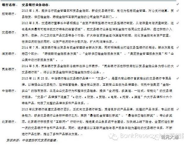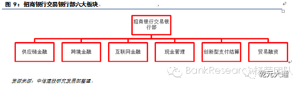 2015年1月,招行撤并总行现金管理部和贸易金融部,新设交易银行部,定位为包括现金管理、对公支付结算、贸易融资、供应链金融、跨境金融和互联网金融的公司金融产品部门。其思路是总行公司金融板块分交易银行和投资银行两大条线,业务将向两端发展——向上发展投资银行业务,服务大型、优质企业直接融资需求;向下夯实基础业务,服务所有企业的交易需求。