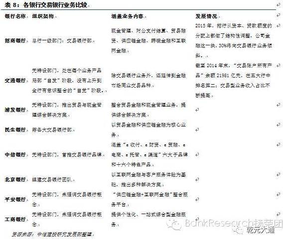 在全球范围内,交易银行已经成为银行的一个重要收入来源,其规模与投资银行业务相当。正因如此,国内银行开始进一步提升交易银行业务的重要性。除了招行已组建交易银行部之外,交行、浦发、民生也提出向交易型银行转型的思路。