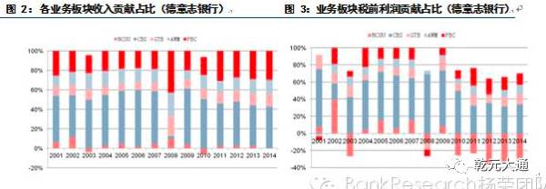 利润方面,2008年金融危机之后,GTB的占比稳步提升,从2008年的亏损,到2012-2014年期间平均贡献约30%。