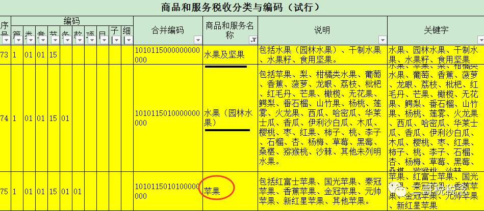 如果你选个没有到末级的编码,就又有问题了。开票品名不能粗于《商品和服务税收分类与编码(试行)》末级编码对应的名称,可以和它相同。你可以写红富士苹果,你编码得选最后一末级,不能选水果及坚果的编码。那很粗!所以你得把这个表仔细看看,先选大类再看大类的末端,认真选!