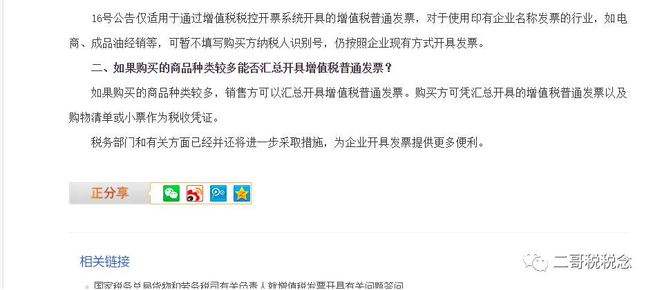 如果购买的商品种类较多,销售方可以汇总开具增值税普通发票。购买方可凭汇总开具的增值税普通发票以及购物清单或小票作为税收凭证。解读上是说明了应该是目前除了增值税专用发票的清单需要从税控打出,其他应该都不强制要求。
