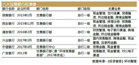 根据《投资者报》记者的研究和采访,目前国内明确提出或已进行交易银行转型的银行已有12家,以股份制银行为主,其中,招商银行、浦发银行、民生银行、兴业银行、中信银行目前已自主在总行层面成立了专门的交易银行部,而此前曾有花旗团队的广发银行在前股东花旗银行的支持下也成立了环球交易服务部。