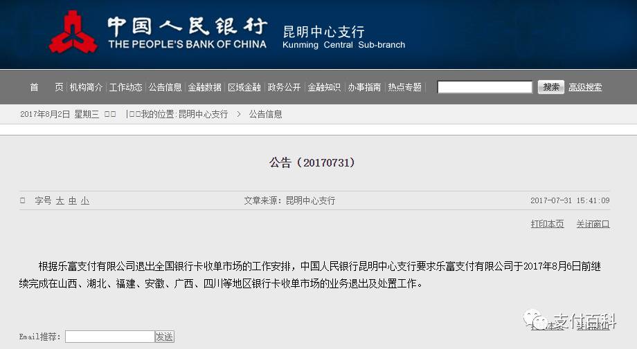 7月14日,央行昆明中心支行发布公告称,根据中国人民银行2017年6月26日对乐富支付有限公司支付业务许可证不予续展并予注销的决定,并要求乐富支付有限公司于2017年7月23日前完成在云南省内银行卡收单市场的业务退出及处置工作。
