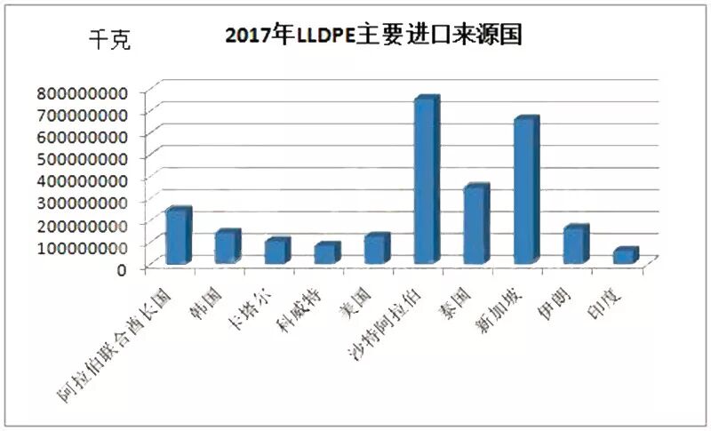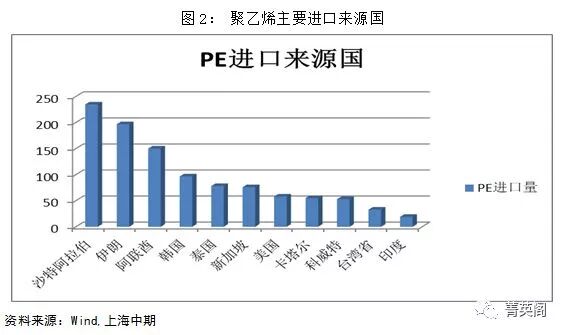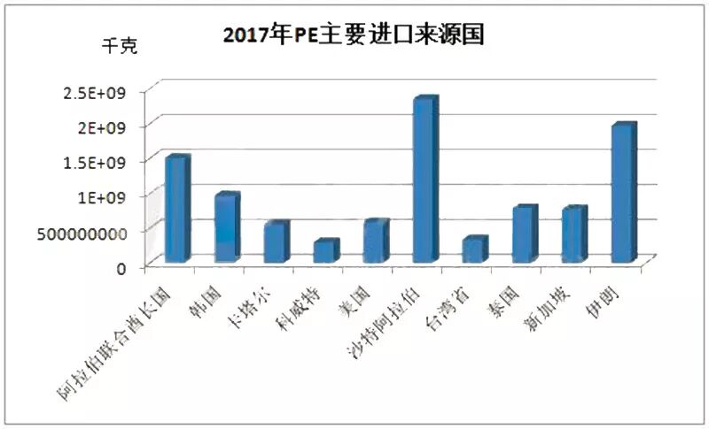 2017年PE进口来源国,美国排名第八,进口总量是50万吨。