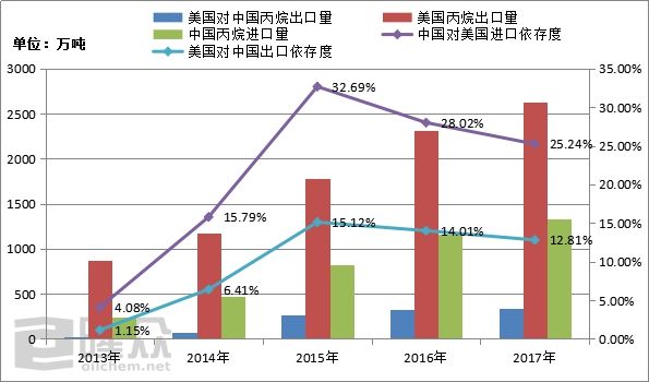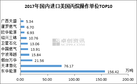 2017年中国进口丙烷总量达1335万吨,其中美国丙烷进口量达337.4万吨,占比高达25%之多,海关数据显示,阿联酋丙烷共426万吨,但其中包括伊朗的转单交易量,所以实际阿联酋对华出口丙烷远远小于海关统计数据,美国是当前中国丙烷的最大来源国。美国丙烷过剩,而中国正是全球丙烷需求大国,也是后续美国开发的主要市场之一。