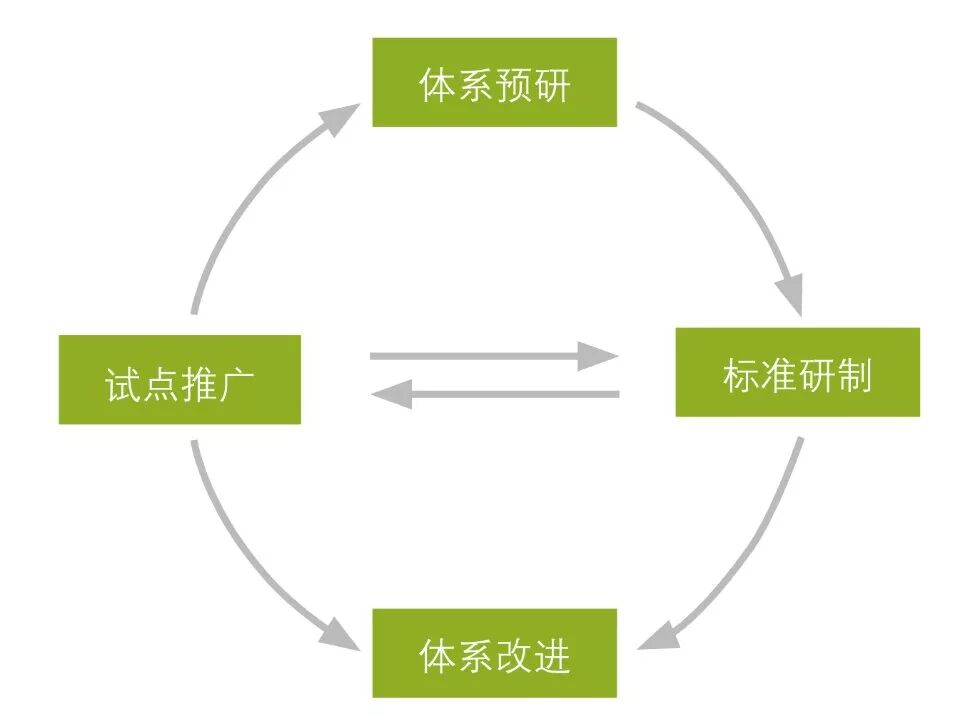 区块链标准化的实施方案主要以标准体系建设为核心,由4个环节组成,即体系预研、标准研制、试点推广、体系改进,这4个环节将促进标准体系不断完善和改进。如图所示: