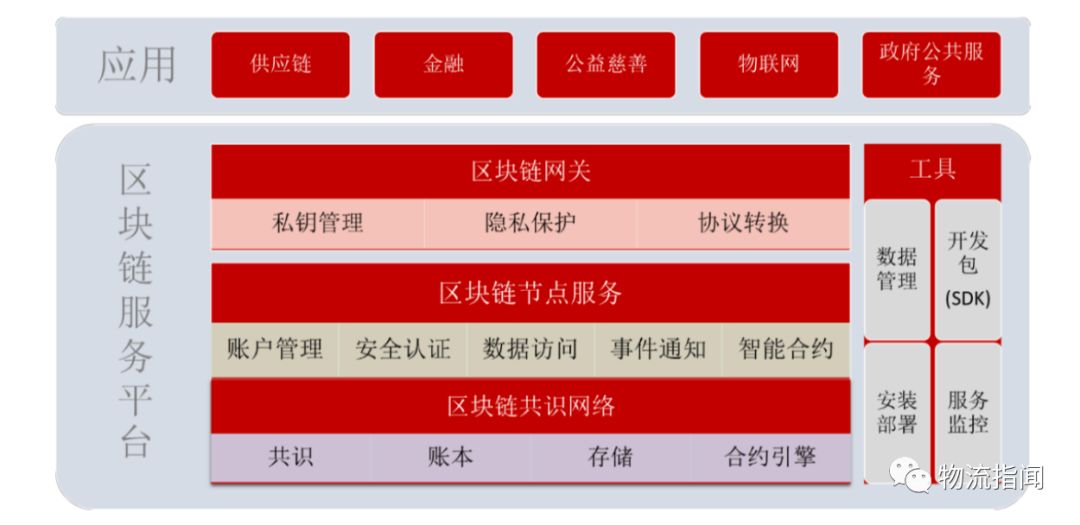 服务平台:“服务平台”是对上层的区块链协议和组件模型的具体实现,由网关、服务、节点网 络、SDK 和一套工具集组成。