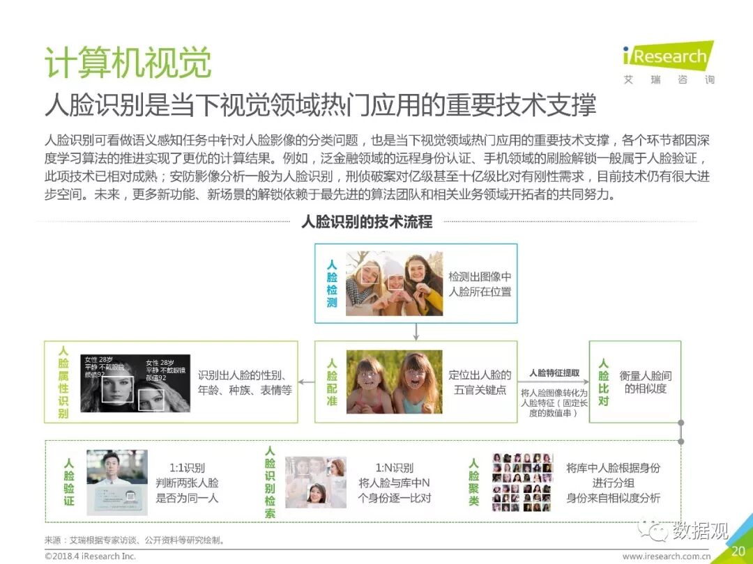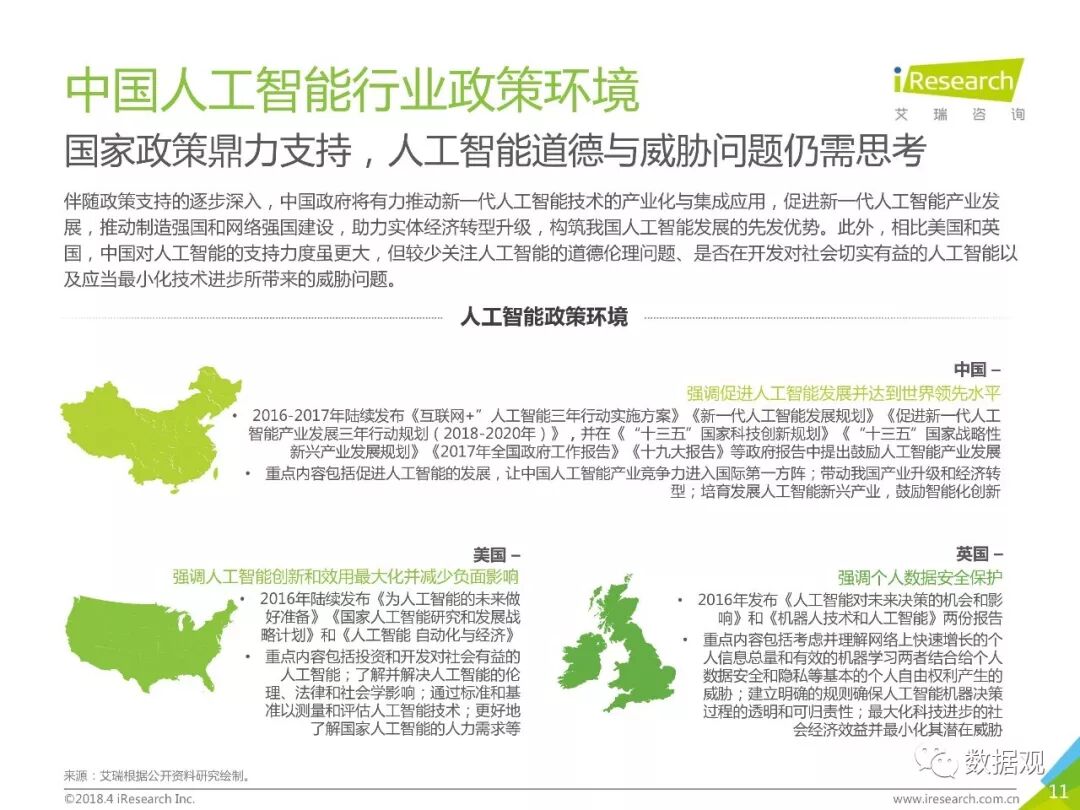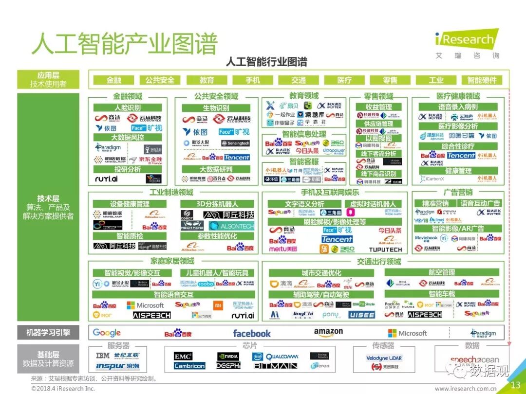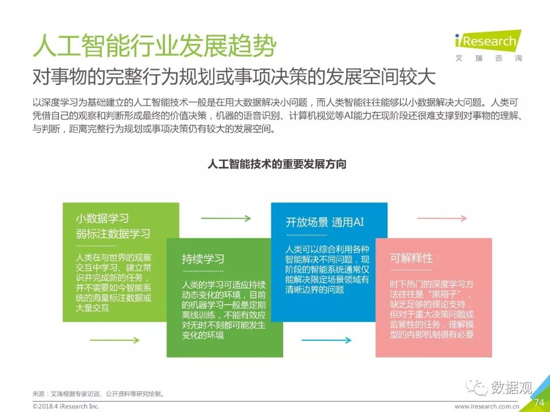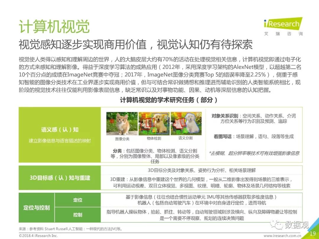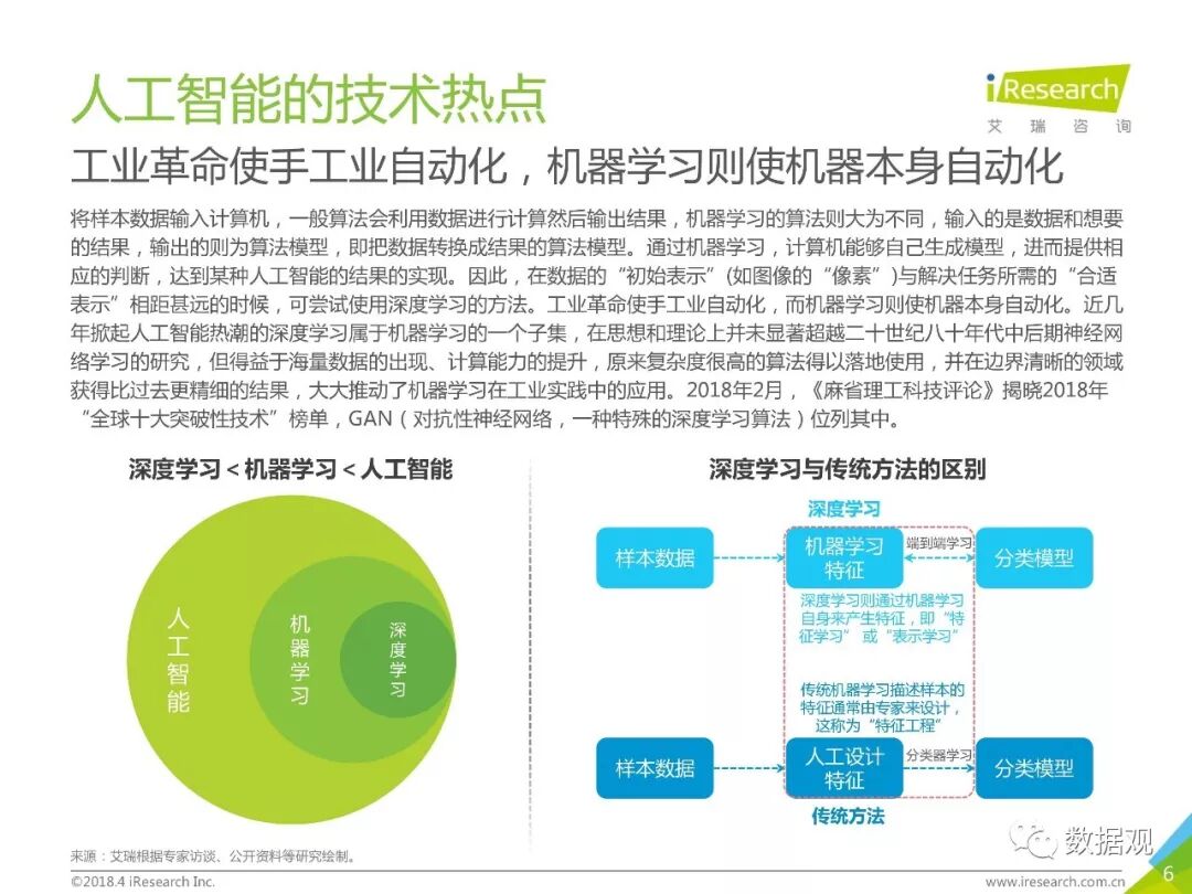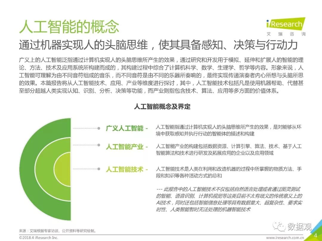 艾瑞研究院发布的《2018年中国人工智能行业研究报告》将从人工智能技术、应用、产业等维度对该行业进行探讨,其中,人工智能技术包括凡是使用机器帮助、代替甚至部分超越人类实现认知、识别、分析、决策等功能,而产业则指包含技术、算法、应用等多方面的价值体系。
