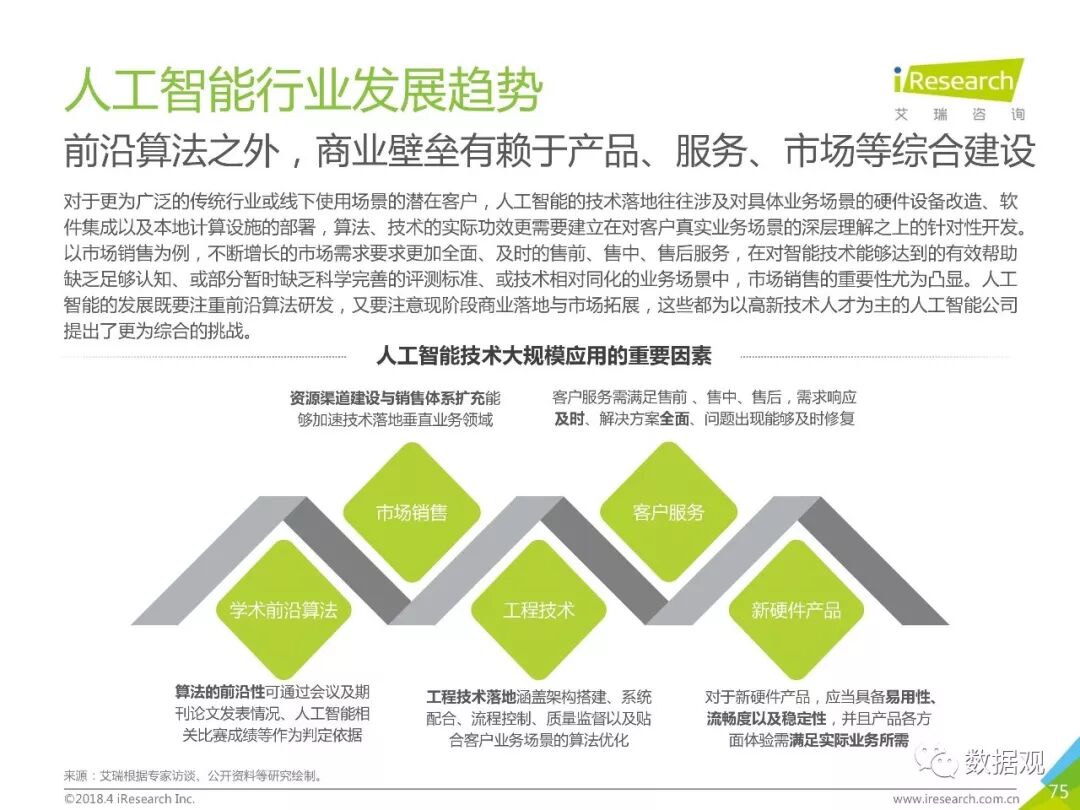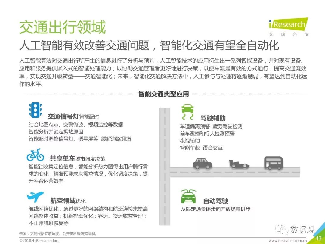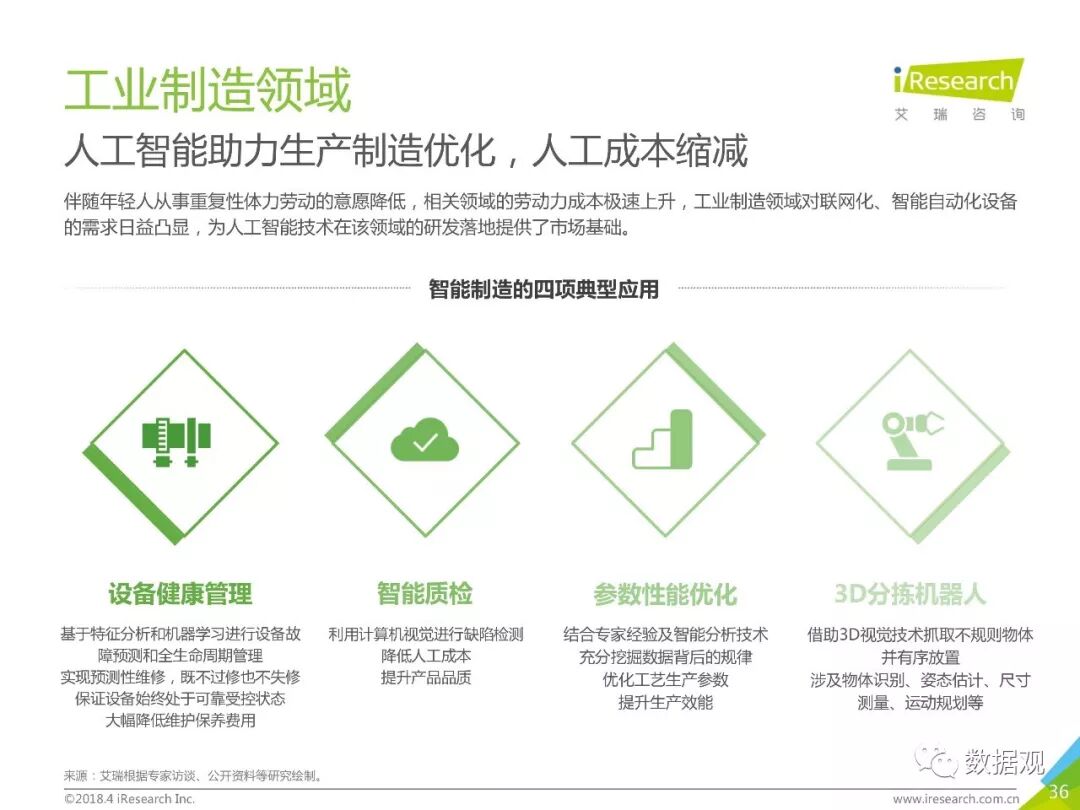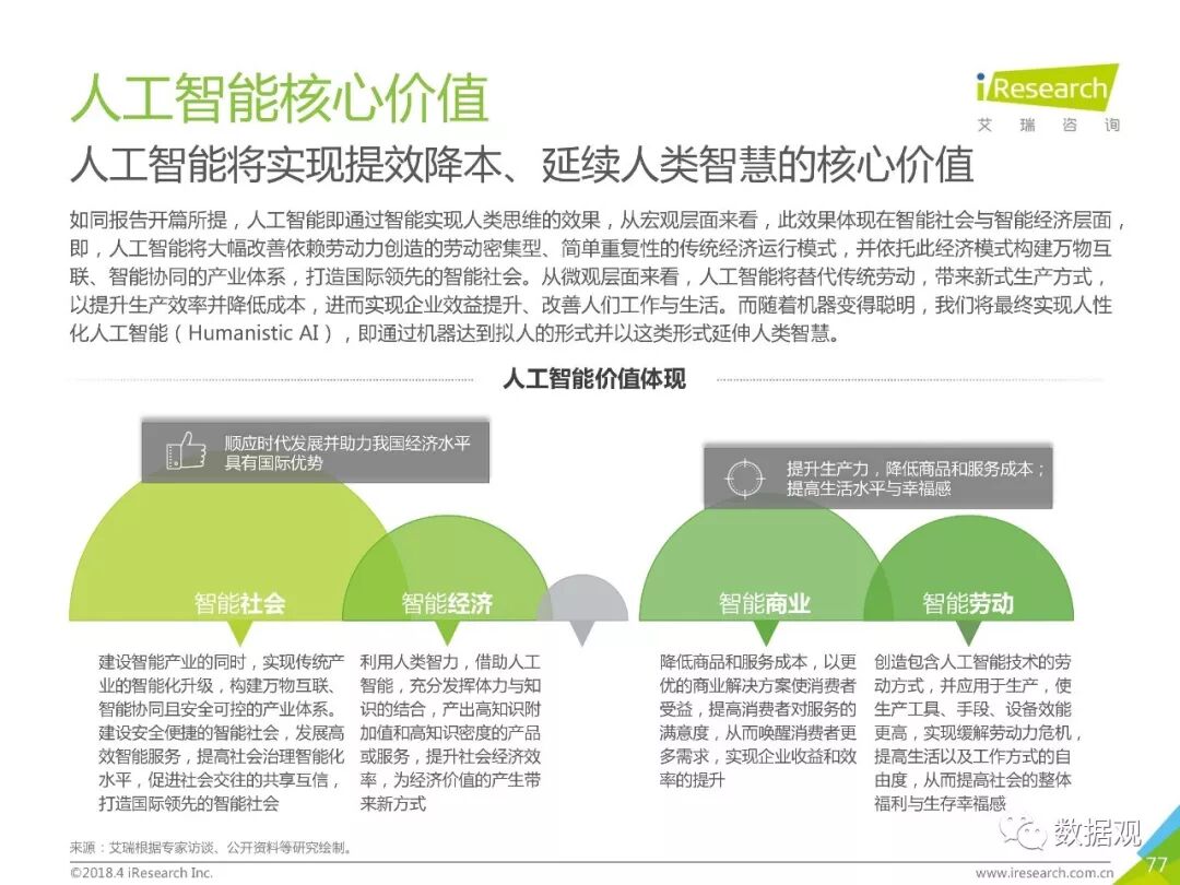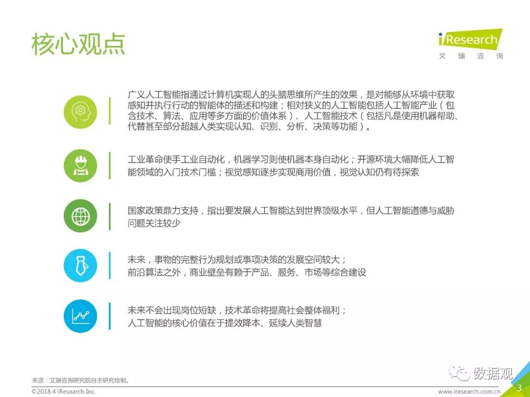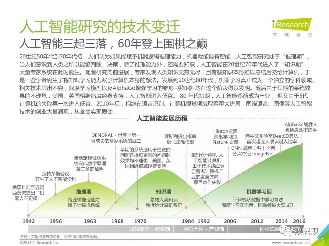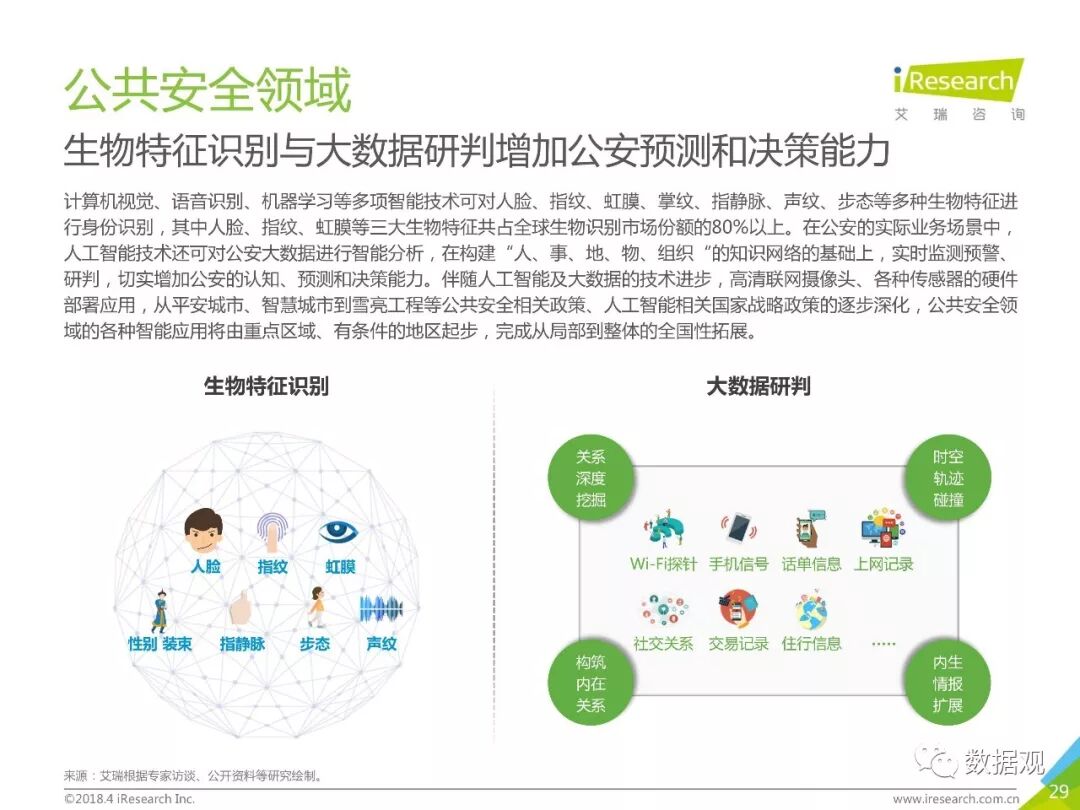 艾瑞研究院发布的《2018年中国人工智能行业研究报告》将从人工智能技术、应用、产业等维度对该行业进行探讨,其中,人工智能技术包括凡是使用机器帮助、代替甚至部分超越人类实现认知、识别、分析、决策等功能,而产业则指包含技术、算法、应用等多方面的价值体系。