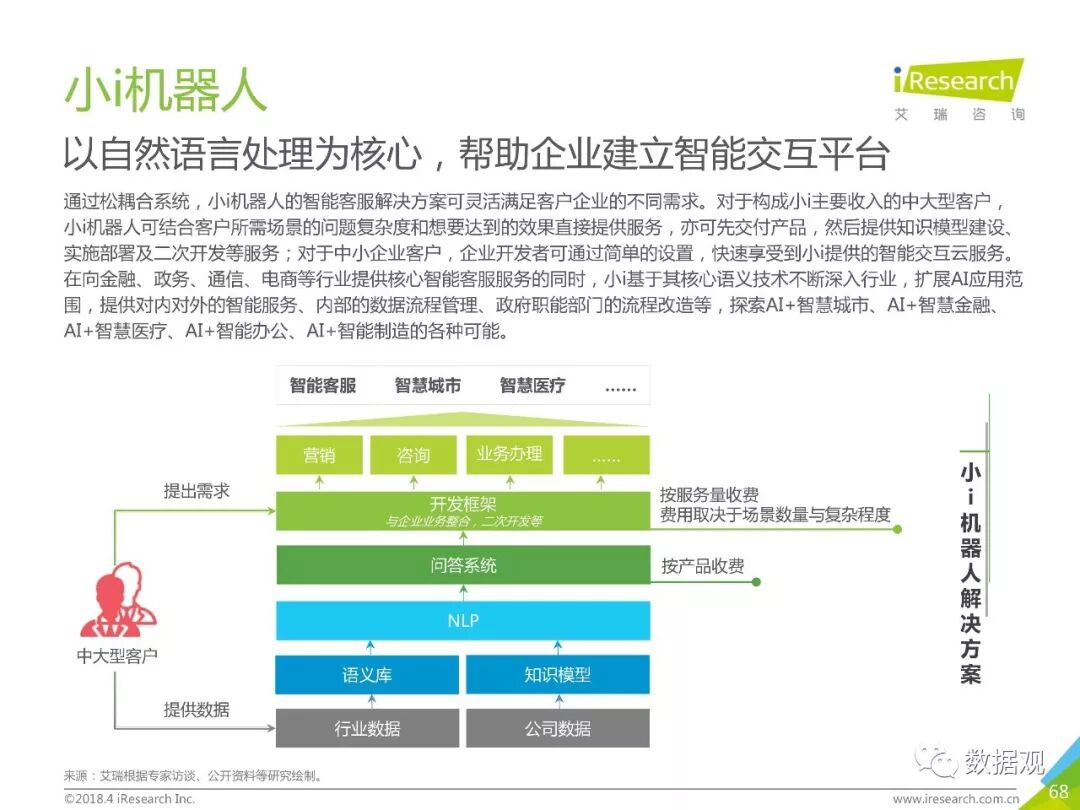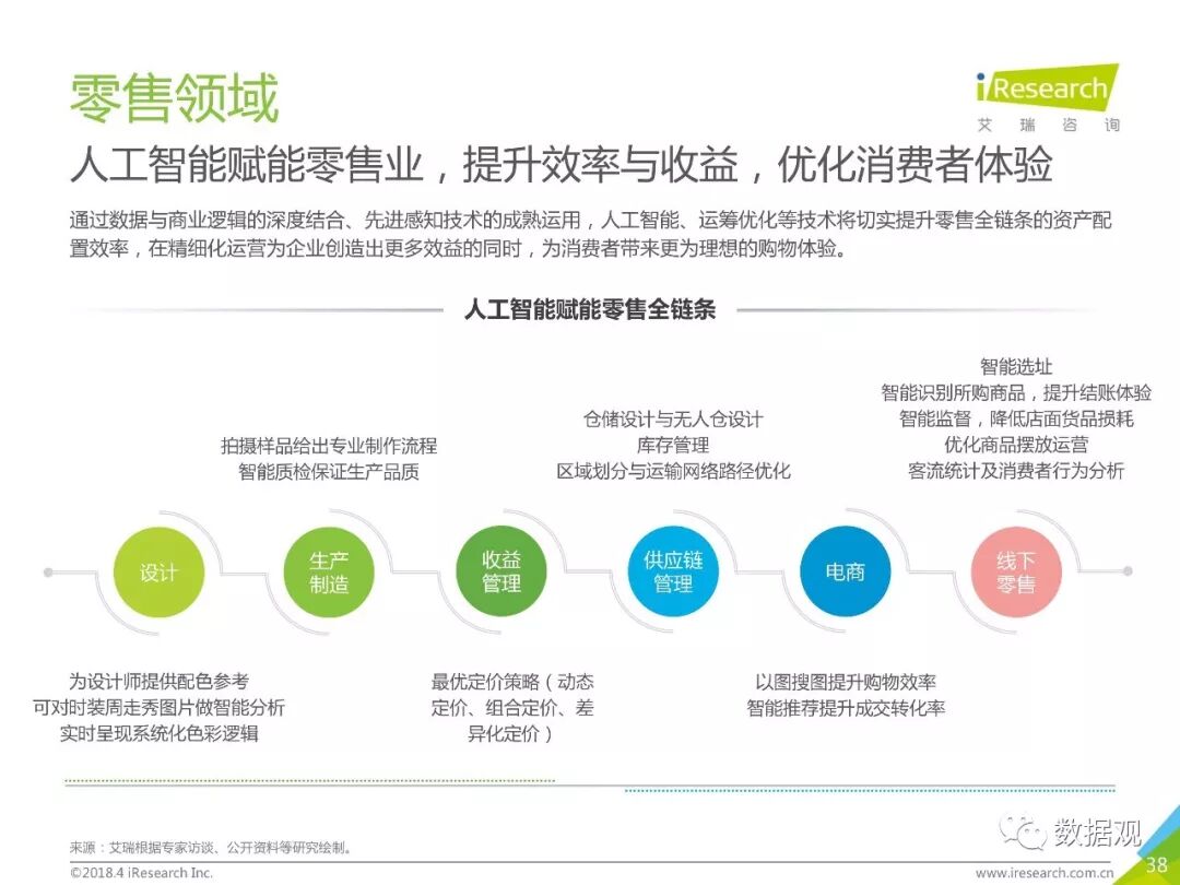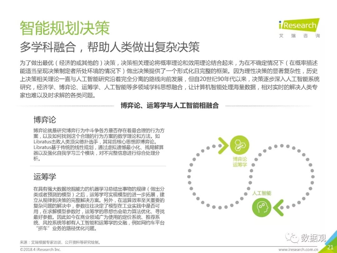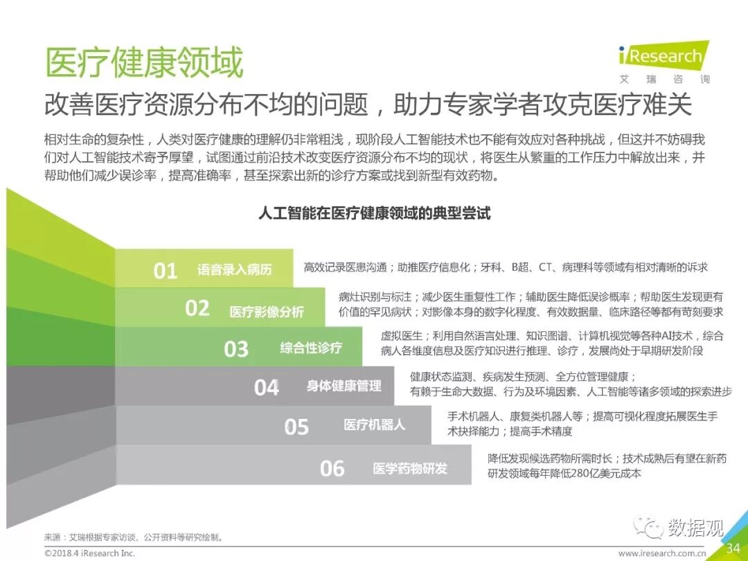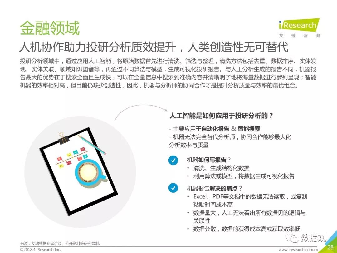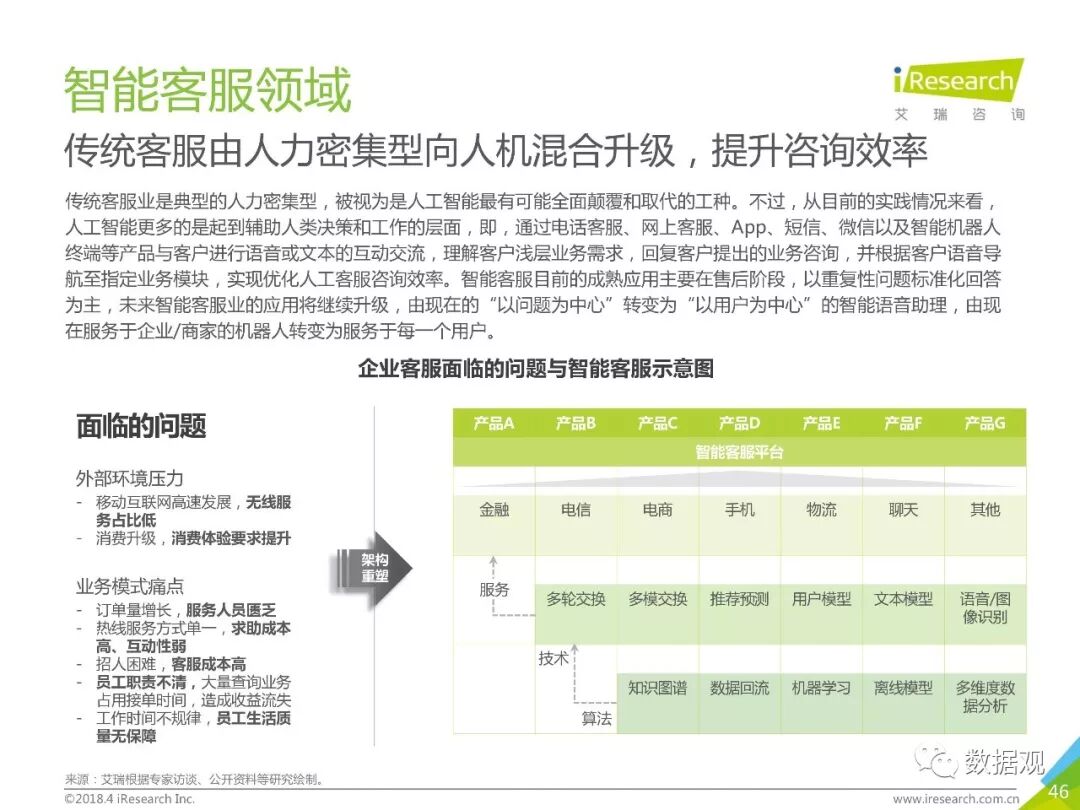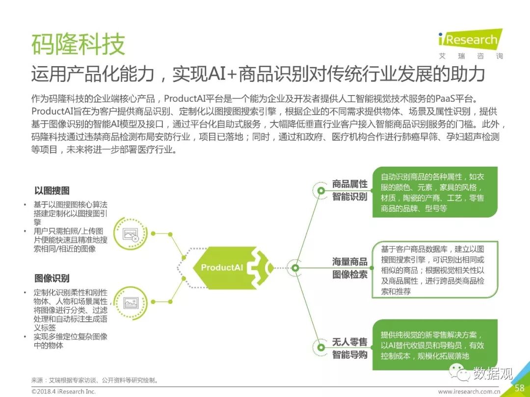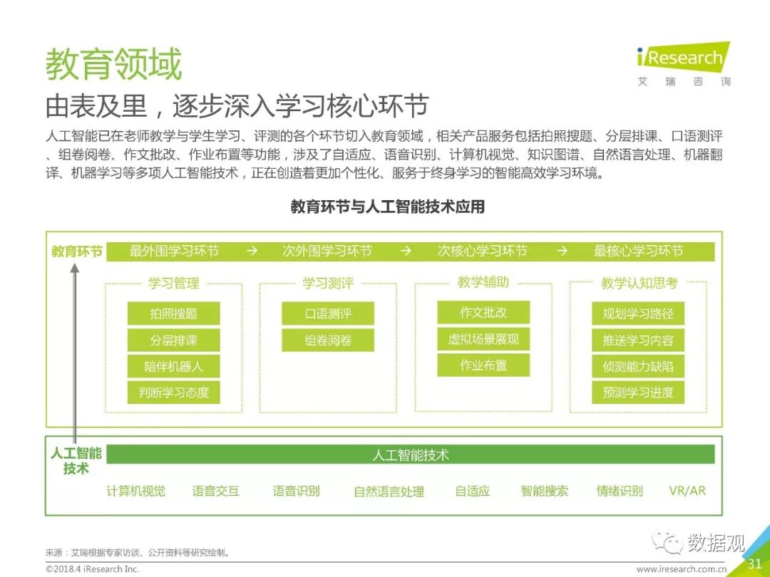 艾瑞研究院发布的《2018年中国人工智能行业研究报告》将从人工智能技术、应用、产业等维度对该行业进行探讨,其中,人工智能技术包括凡是使用机器帮助、代替甚至部分超越人类实现认知、识别、分析、决策等功能,而产业则指包含技术、算法、应用等多方面的价值体系。