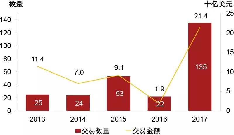 2013年至2017年中国大陆企业赴“一带一路”并购交易数量及金额