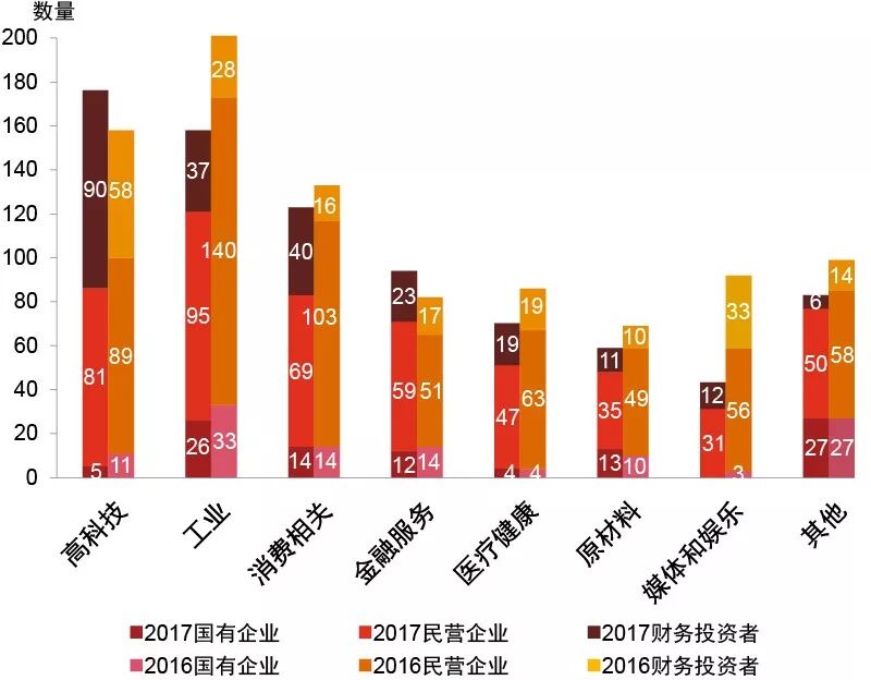 中国大陆企业海外并购交易数量按投资行业分类, 2017年对比2016年