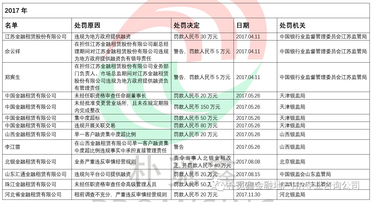 2017年共7家金租公司及个人遭罚