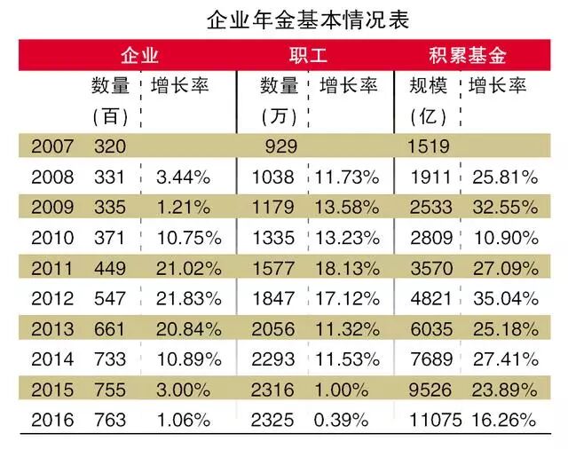 企业年金扩面明显减速 根据人社部的数据来看,2017年企业年金的规模比2016年增长16.3%。但记者 通过对比发现,增速相较近十年依然属于较低的水平。