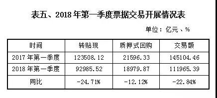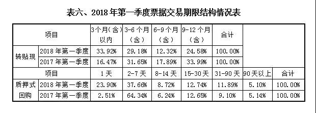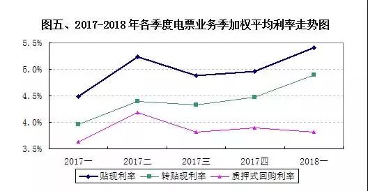 (四)票据利率总体有所上行 2018年第一季度,电票贴现加权平均利率为5.41%,比上季度提高45个基点;转贴现加权平均利率为4.9%,比上季度提高42个基点;质押式回购加权平均利率为3.81%,比上季度下降8个基点。