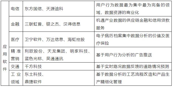 根据数据从产生到应用、继而产生新数据的过程,大数据产业形成了一个环形产业链。从数据产生到应用,参与企业逐渐增多,数据价值也逐级放大。1、大数据IT基础设施:天玑科技、银信科技、网宿科技2、数据资源获取:主要是通过移动终端、车载终端、互联网等方式来获取,阿里、腾讯和京东是主要资源获取渠道,其他还有:科大讯飞(语音数据)、四维图新(车载用户数据)、易联众(企业人力资源数据)、恒生电子(金融数据)等。3、大数据存储:光环新网(云存储)、紫光股份(云储存)、数据港、海量数据、东方国信4、数据整合和分析:数据整合(IB),用友软件、久其软件、捷成股份、浪潮信息、华胜天成、荣之联、东方国信;数据综合处理,拓尔思、东方国信、美亚柏科5、数据安全:启明星辰、绿盟科技、卫士通、北信源、蓝盾股份6、数据应用和消费:其实也就是最下游的行业,这部分内容是最多的。